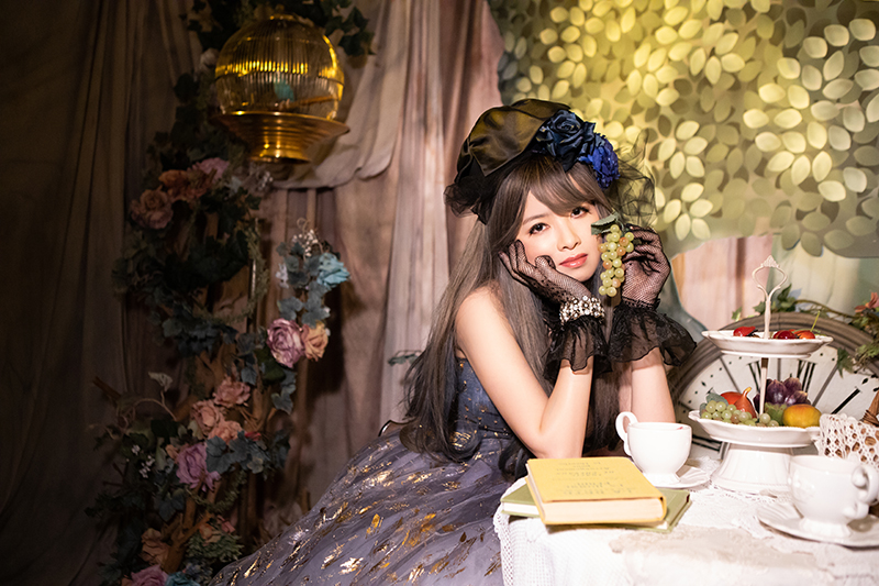 ダークな色合いのドレスで大人可愛い「森のティーパーティー」、赤い照明にスパンコールのミニスカートがきらびやかな「秘密の書斎」での撮影でした。